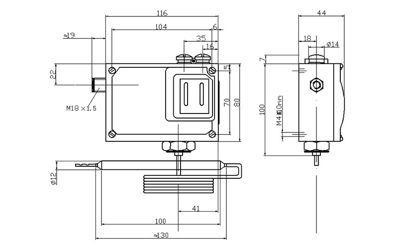 541/7T溫度控制器采用帶毛細管溫包式傳感器,可用于流動的中性氣體和液體介質,如果介質為腐蝕性,安裝時可選用不銹鋼溫包保護套套在銅質溫包外(見附件)。541/7T溫度控制器的設定值可調,調節范圍-30~280℃。